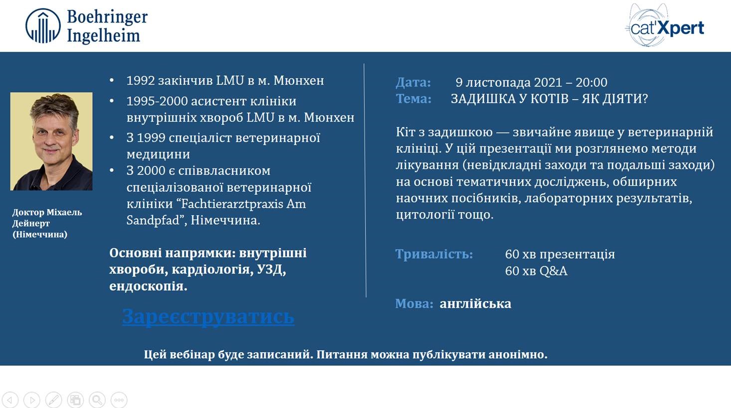 Ласкаво просимо на вебінар 09.11.2021р. від Boehringer Ingelheim Animal Health: ЗАДИШКА У КОТІВ – ЯК ДІЯТИ? Експертна оцінка від доктора Ліхаеля Дейнерта (Німеччина).